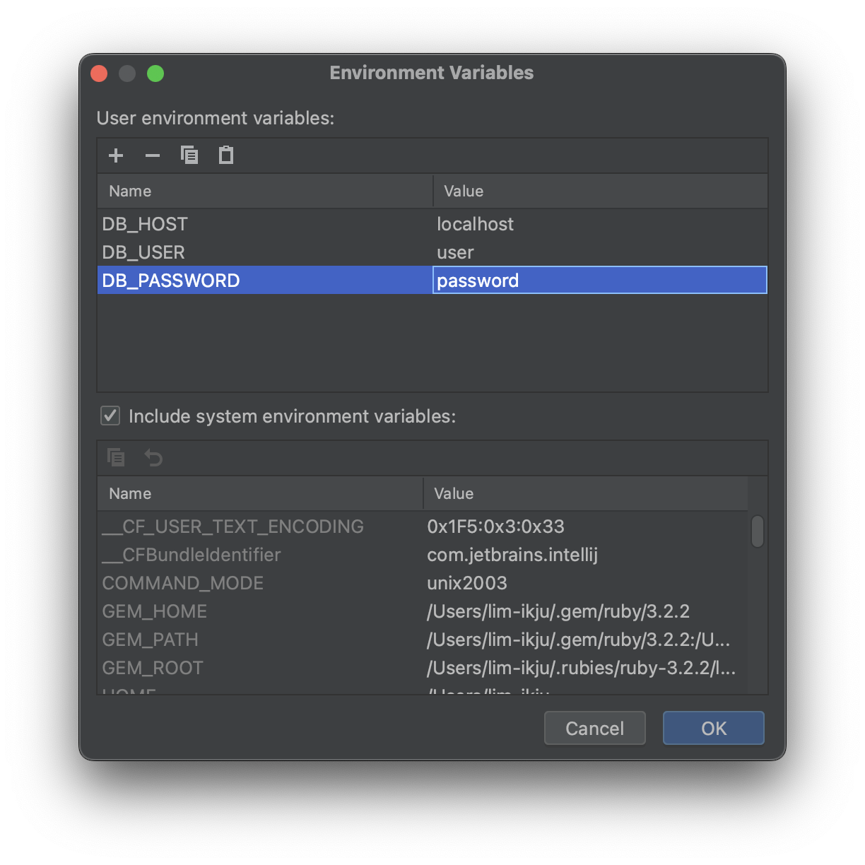 application.yml에서 사용하는 환경변수 3개를 환경변수로 추가해줍니다.