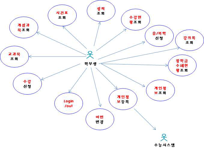- 교과목조회, 개설과목조회, 수강신청, 수강현황조회, 휴/복학신청, 성적조회, 시간표조회, 강의록조회, 장학금수혜현황조회, 개인정보등록, 개인정보등록, 개인정보조회, 로그인/로그아웃, 비번변경
